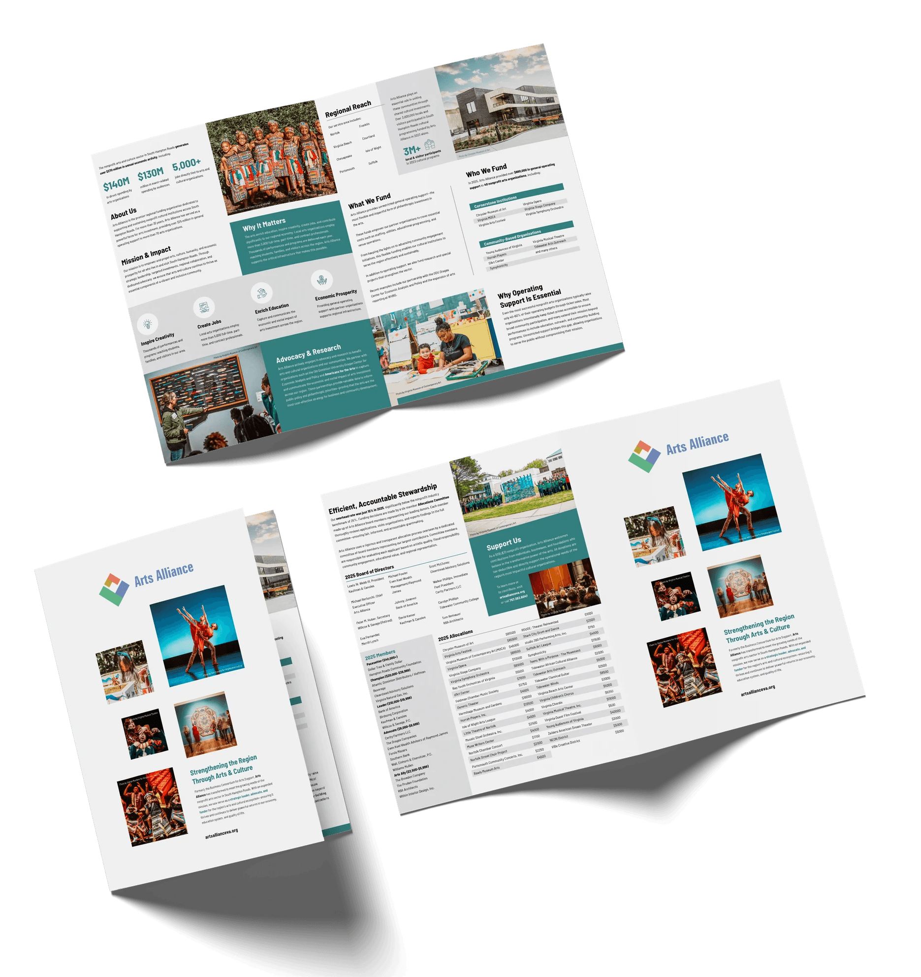 Using that system, I created a set of reusable pieces that cover the key moments: an overview one-pager about impact and grants, an Arts Alliance 100 one-pager that outlines member benefits and committee projects, a donor recognition card sized for newspaper placements, a document template with a branded header for official use, a bi-fold fund brochure that expands the story with imagery and lists leadership, and an AEP6 infographic one-pager that connects arts investment to local economic results.