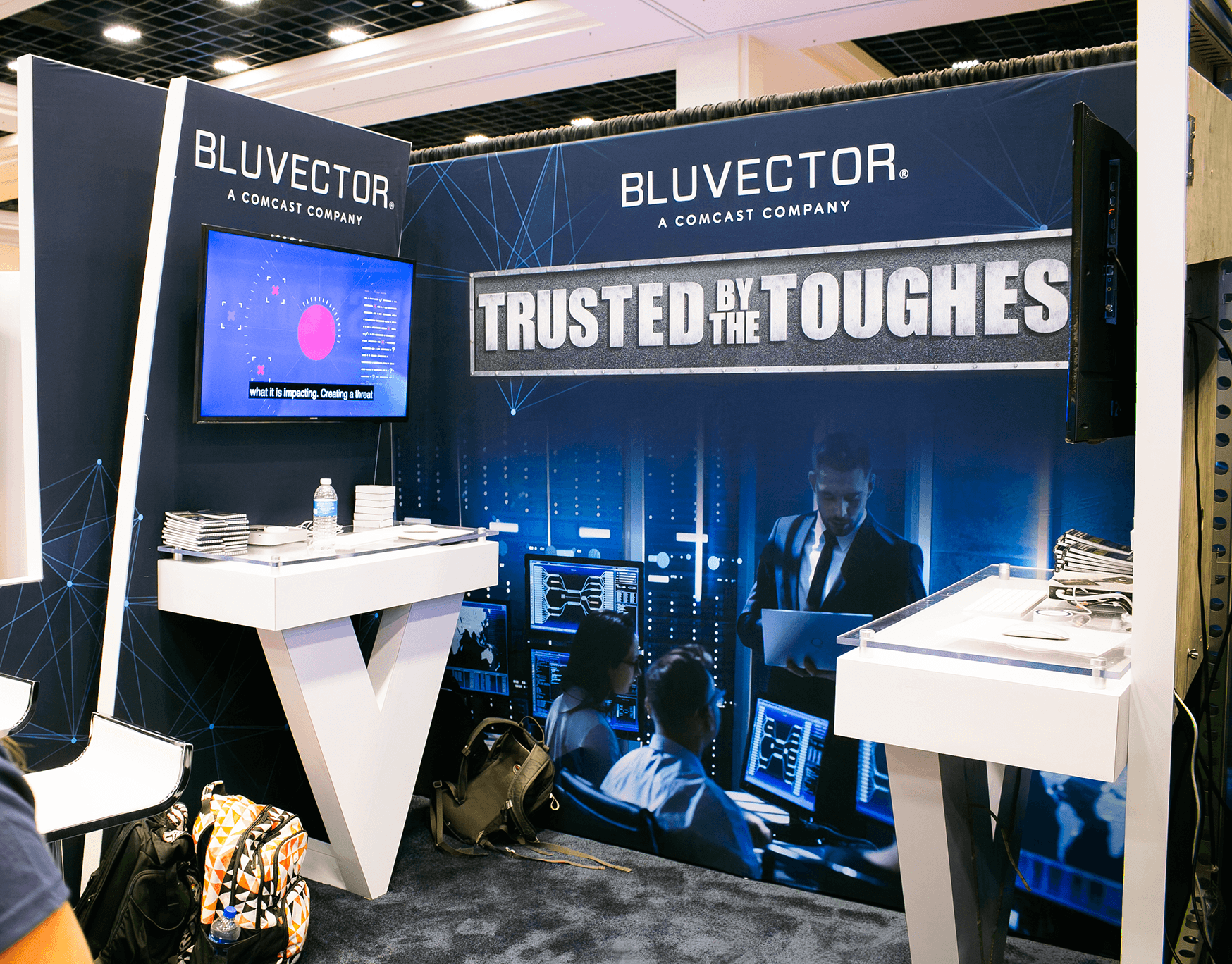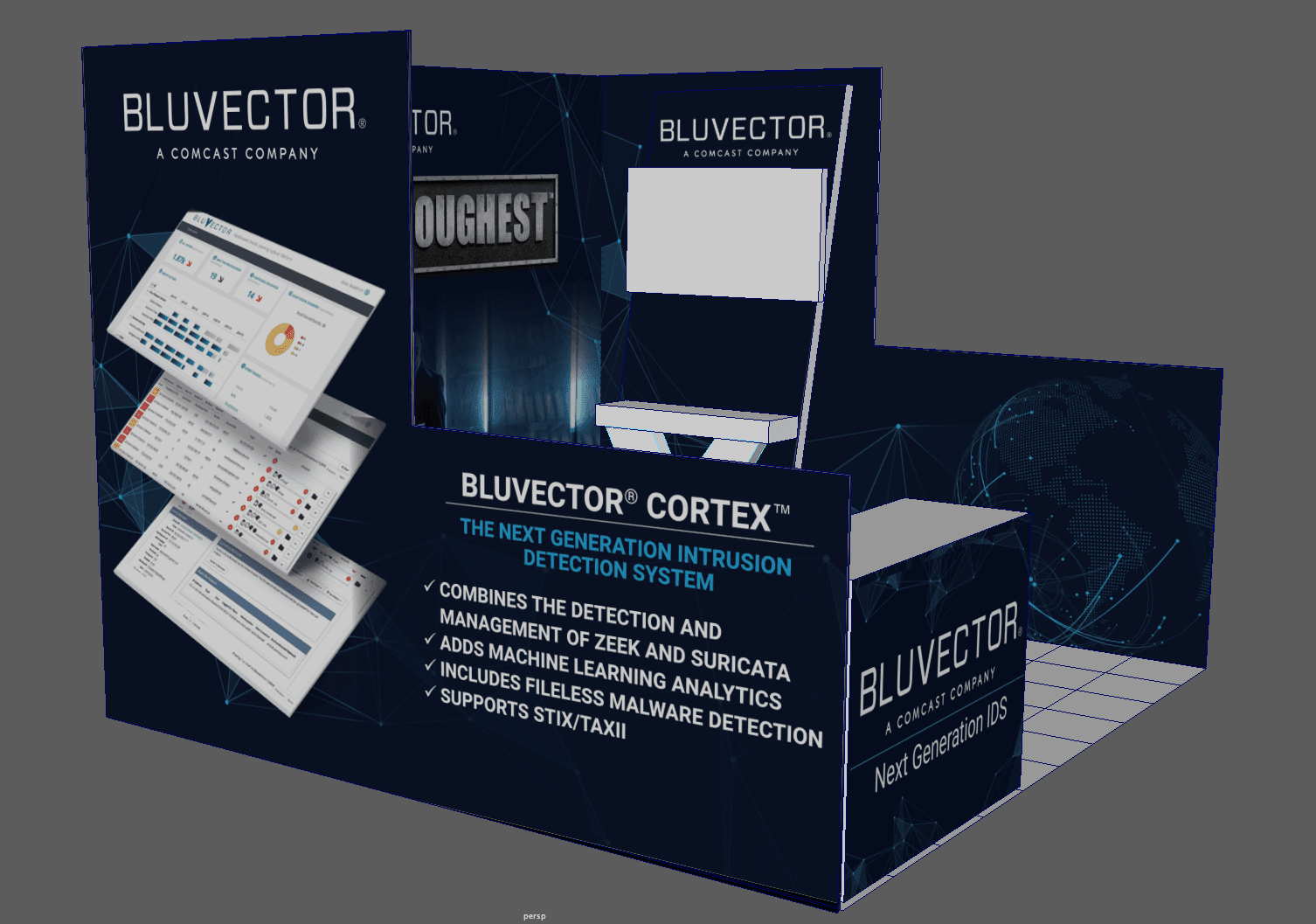 The request for this booth design was to fit a 10 x 10 space, at a major cybersecurity conference, with branding to visually match the audience with an overall dark, military-themed esthetic.