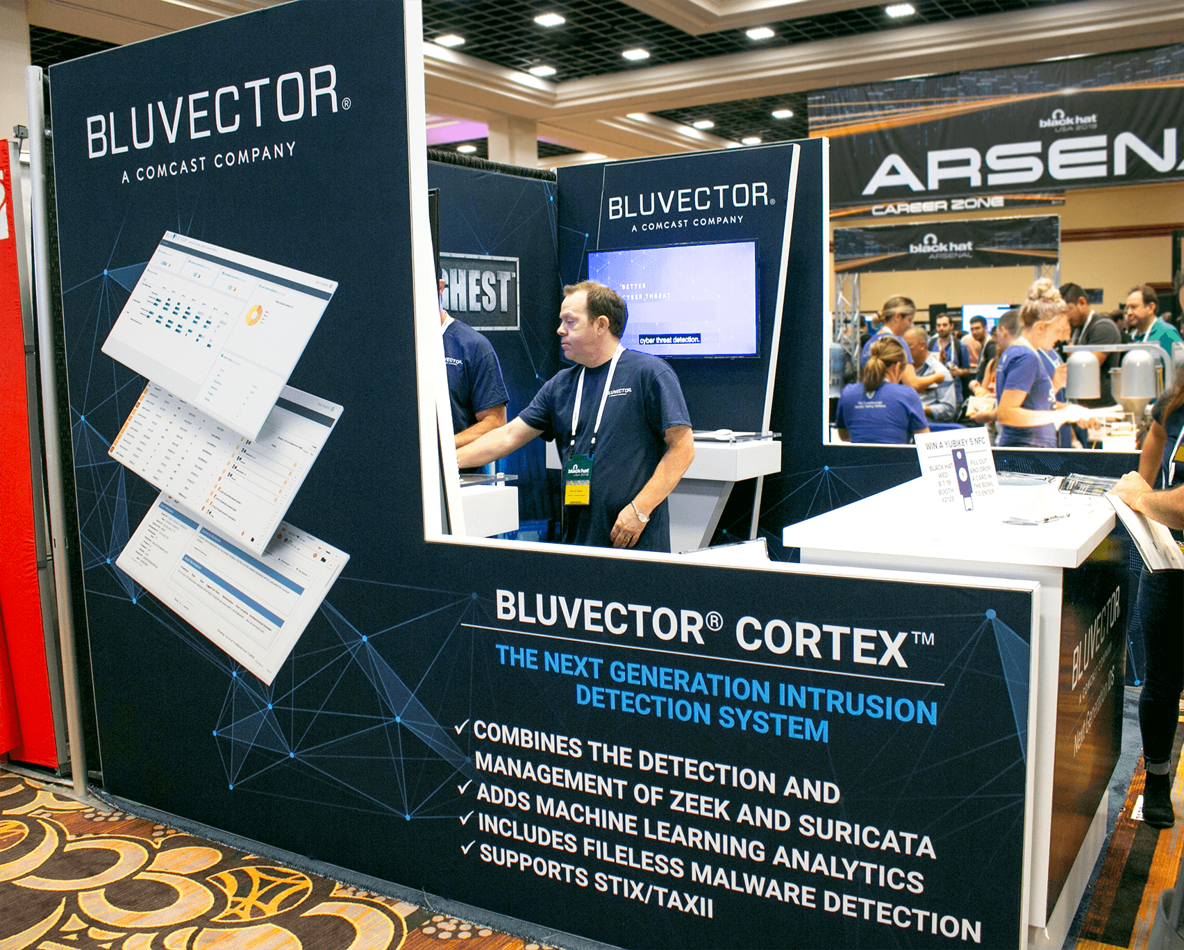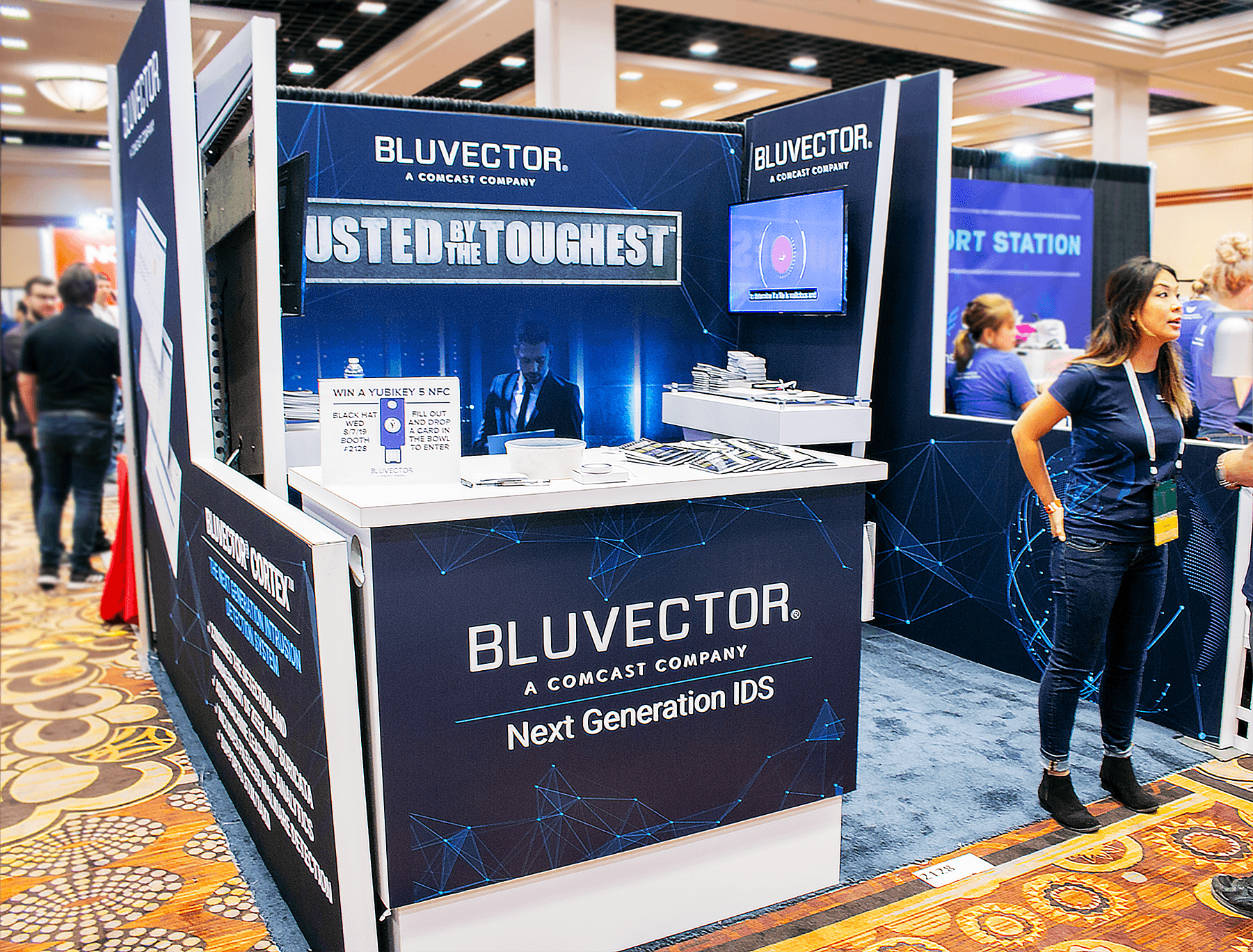 Modular panels, consistent lighting, and product visuals aligned with the dark, defense focused look while staying cost efficient, so every side of the booth worked as a clear invitation to stop.