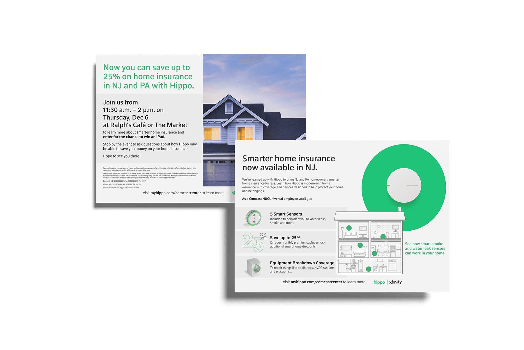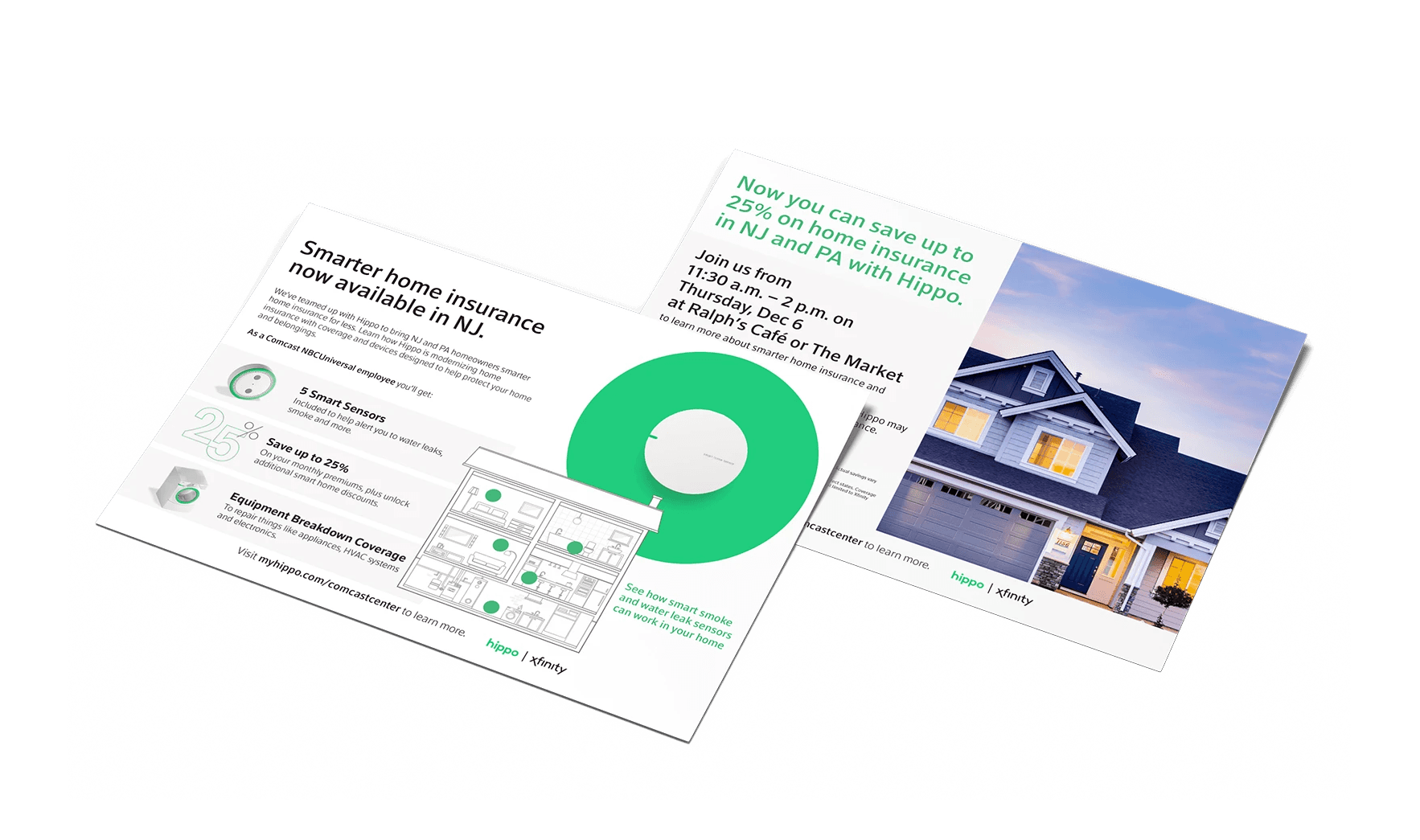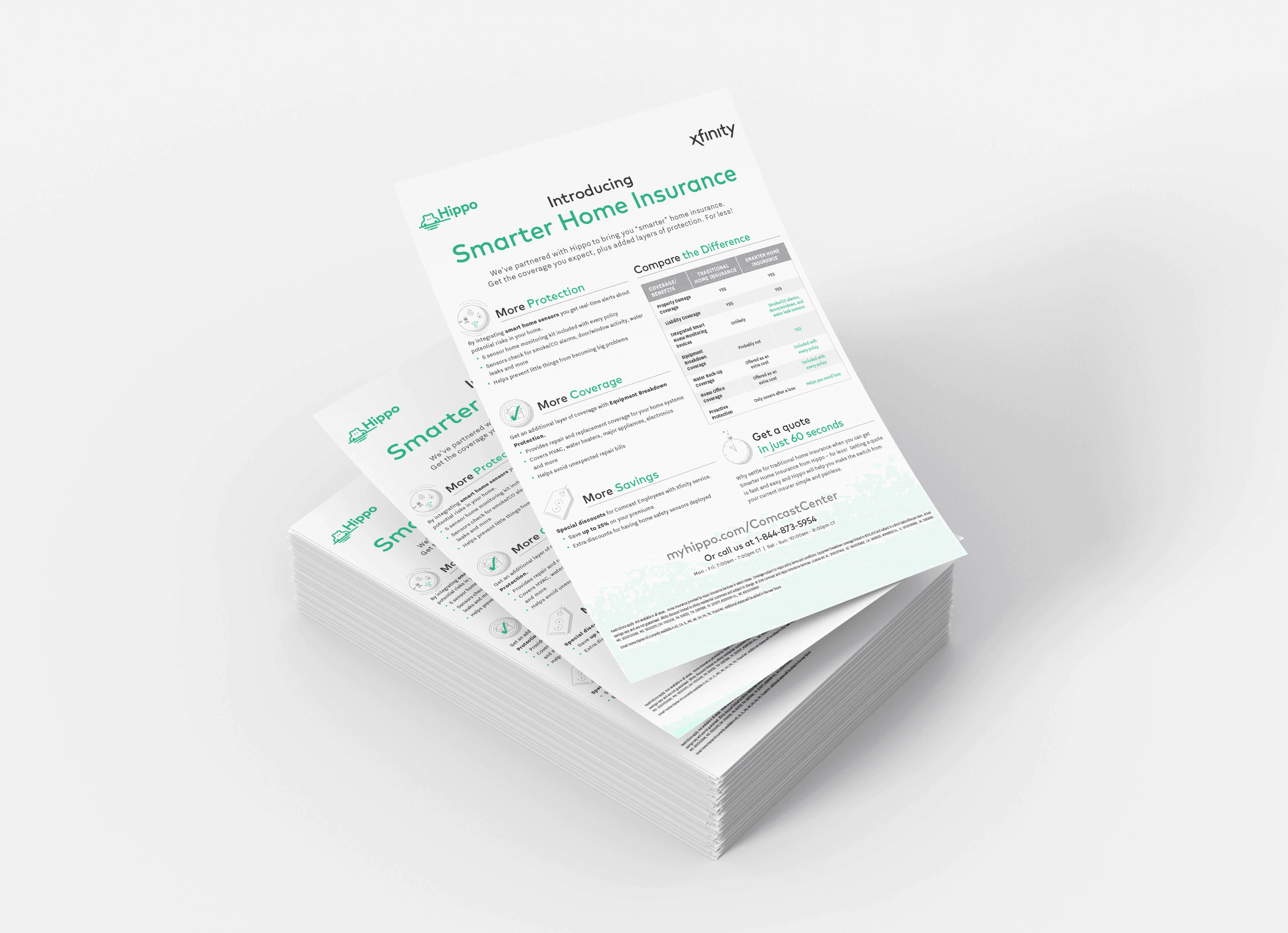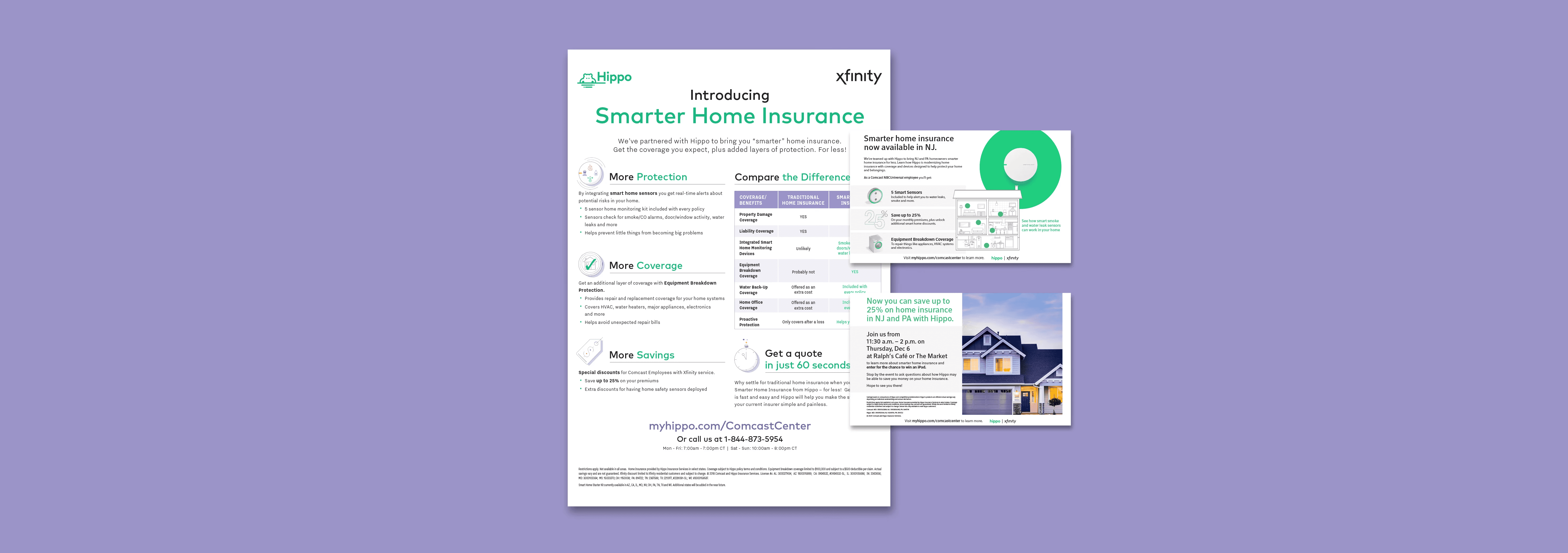 Comcast asked for a simple, modern set of print pieces to introduce Hippo Insurance's “smarter” home insurance offerings to employees at an on-site event and around office locations.