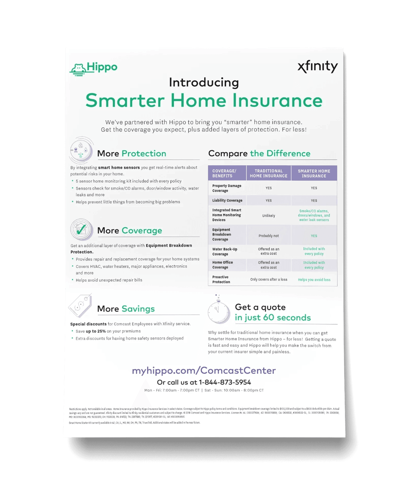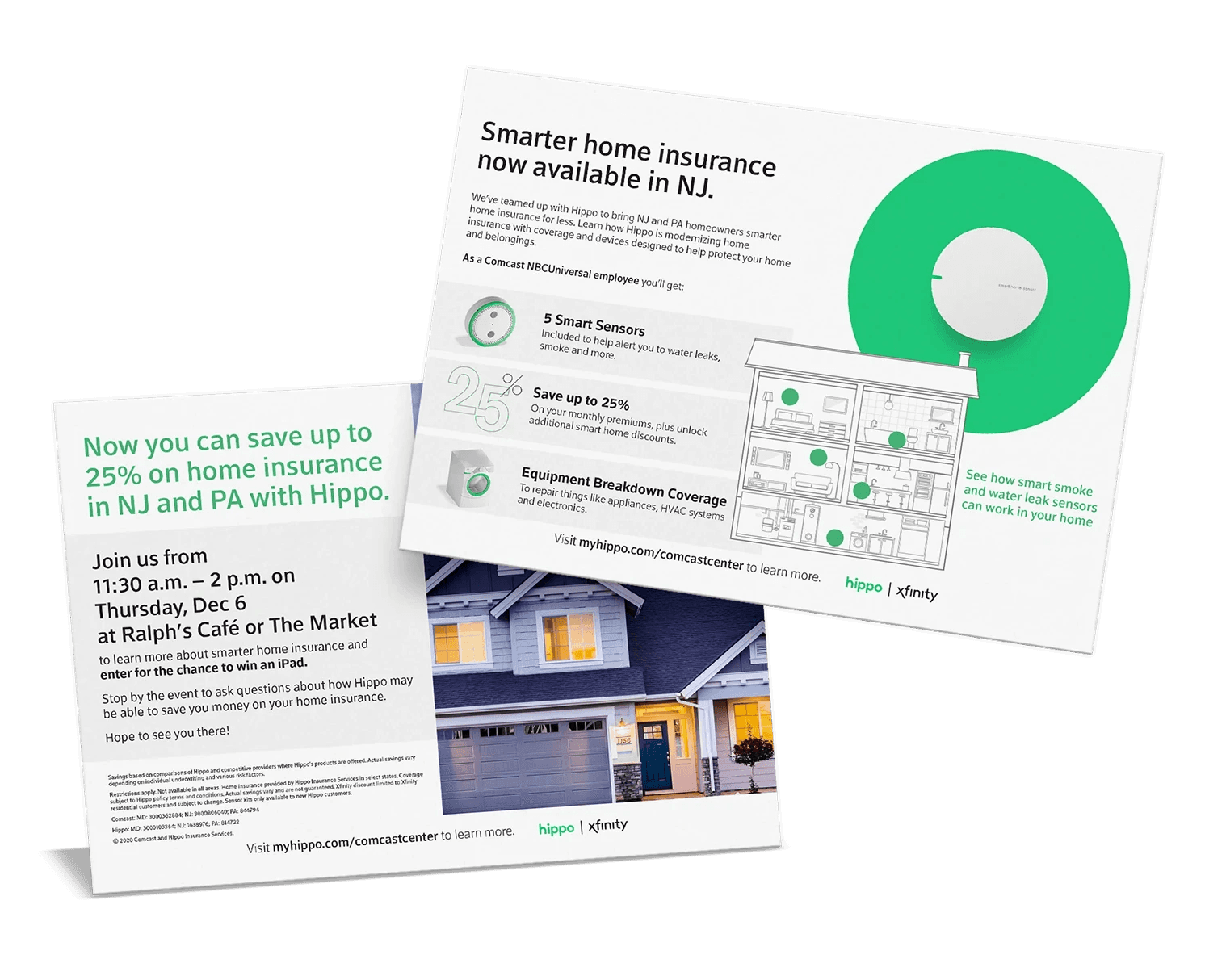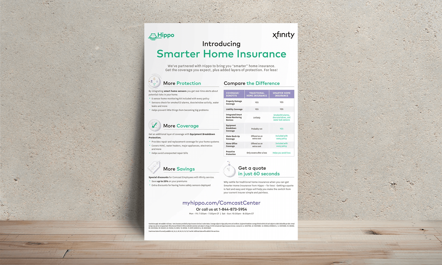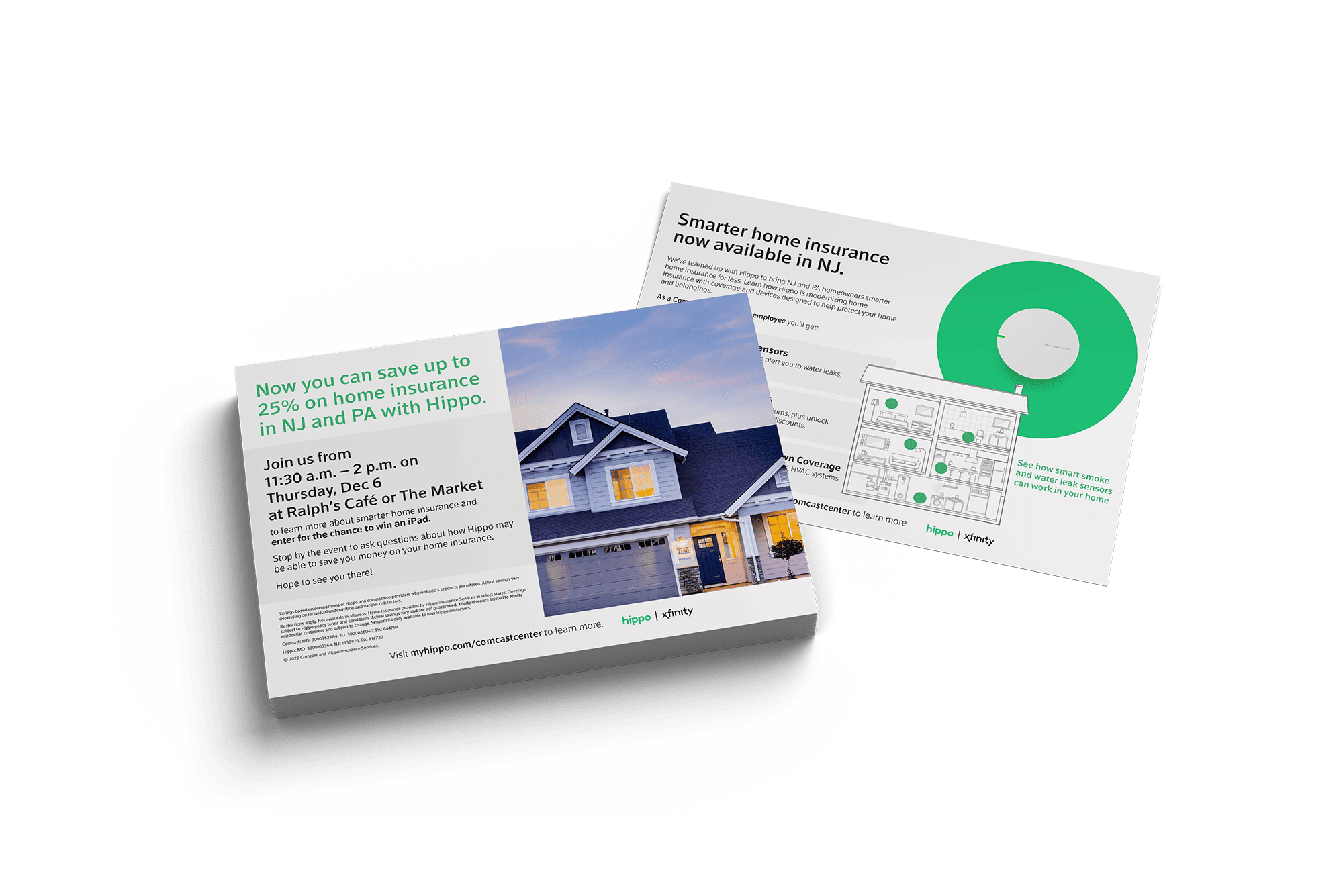 Comcast asked for a simple, modern set of print pieces to introduce Hippo Insurance's “smarter” home insurance offerings to employees at an on-site event and around office locations.