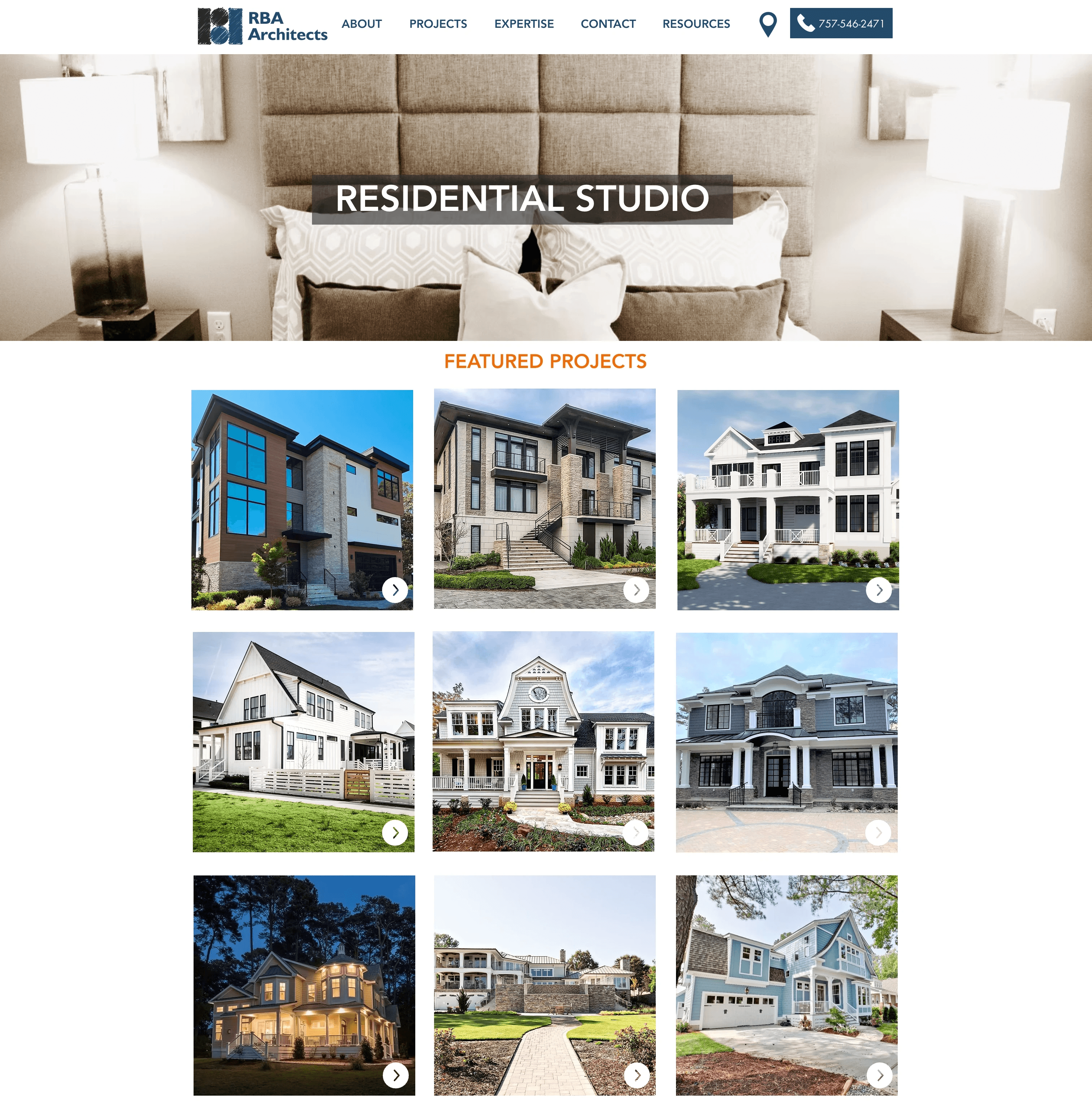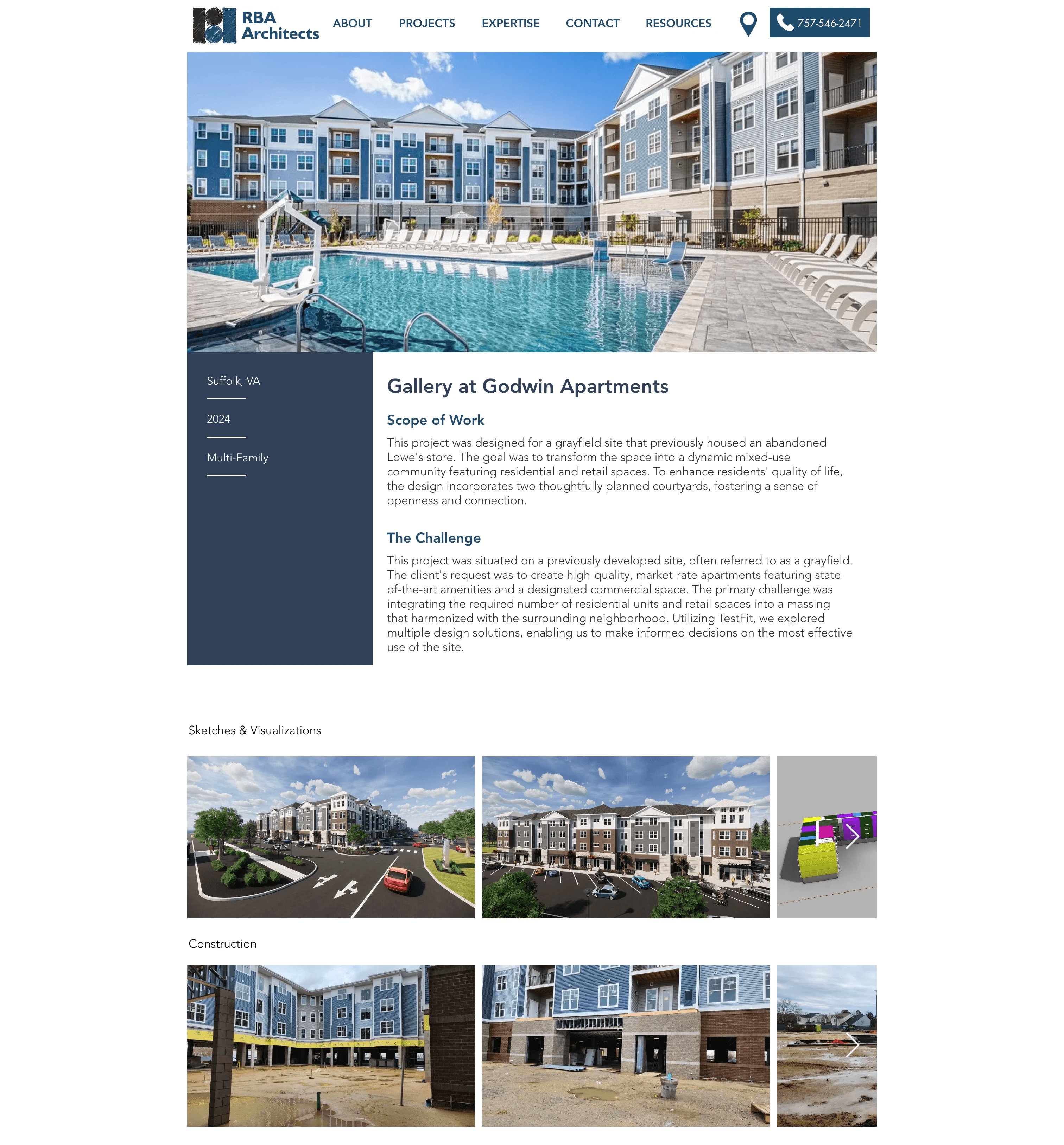 Each individual project page explains expertise, typical project scopes, and the value RBA brings to different client types, supported by concise project highlights and strong imagery that lets the architecture lead.