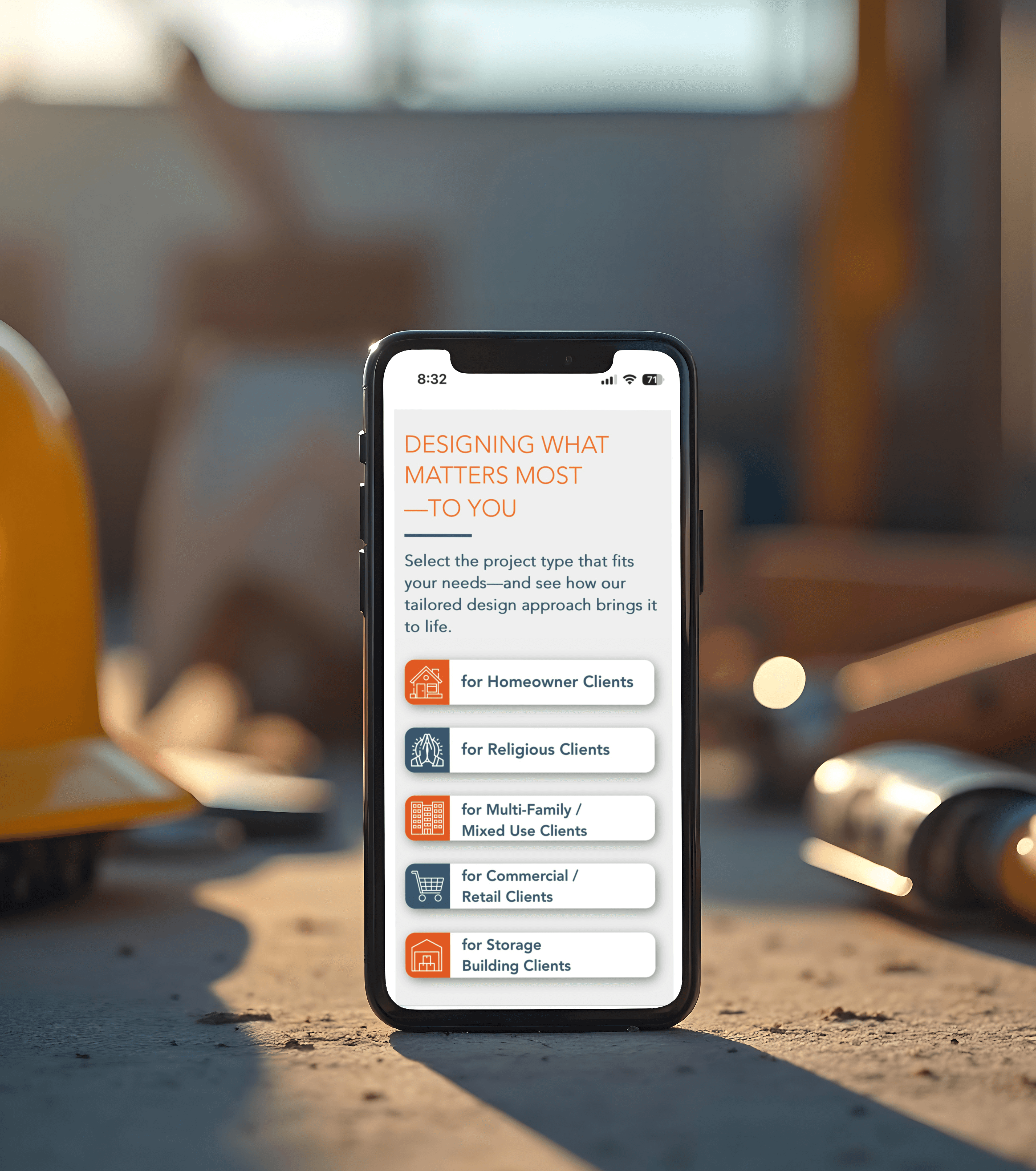 The new structure showcases the firm’s work by sector with clear visual galleries for multi-family, commercial and retail, religious, and in-progress projects.